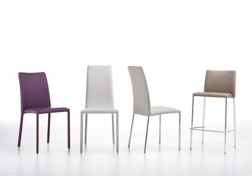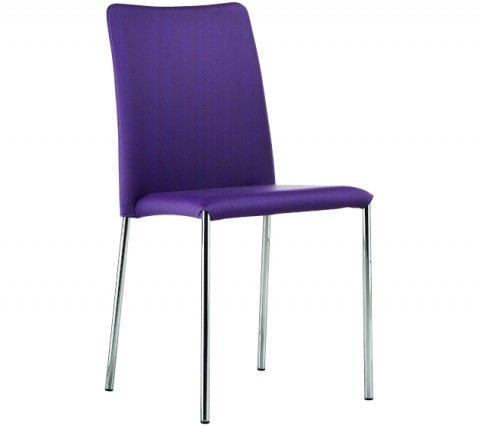 Chair with four leg structure in lacquered or chrome steel. Seat and backrest upholstered in hide or leather, faux leather or fabric.