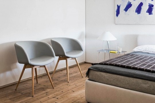 Chair armrests and four leg frame in wood or lacquered steel. Seat upholstered in leather, faux leather, fabric or custom’s fabric. Available the version with backshell in quilted faux leather or different material.