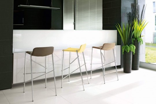 Fix stool with four-leg frame in chrome or lacquered steel. Seat upholstered in leather, ecoleather, fabric or custom’s fabric. Seat height: 65cm (25.6″) or 75cm (29.5″).