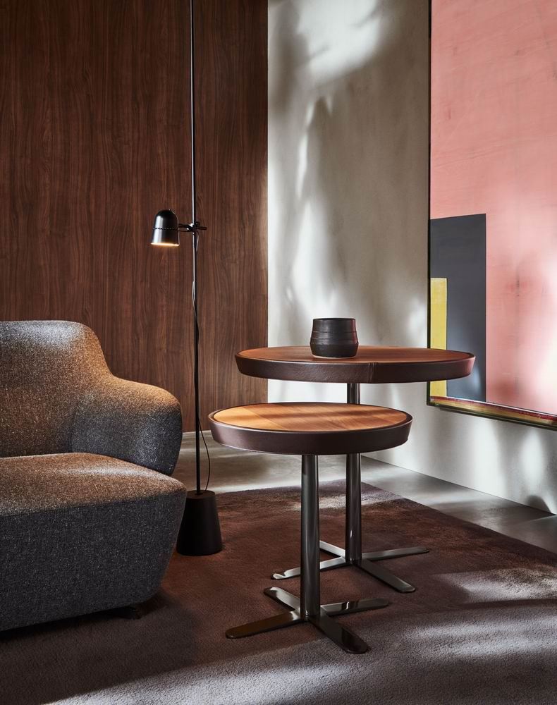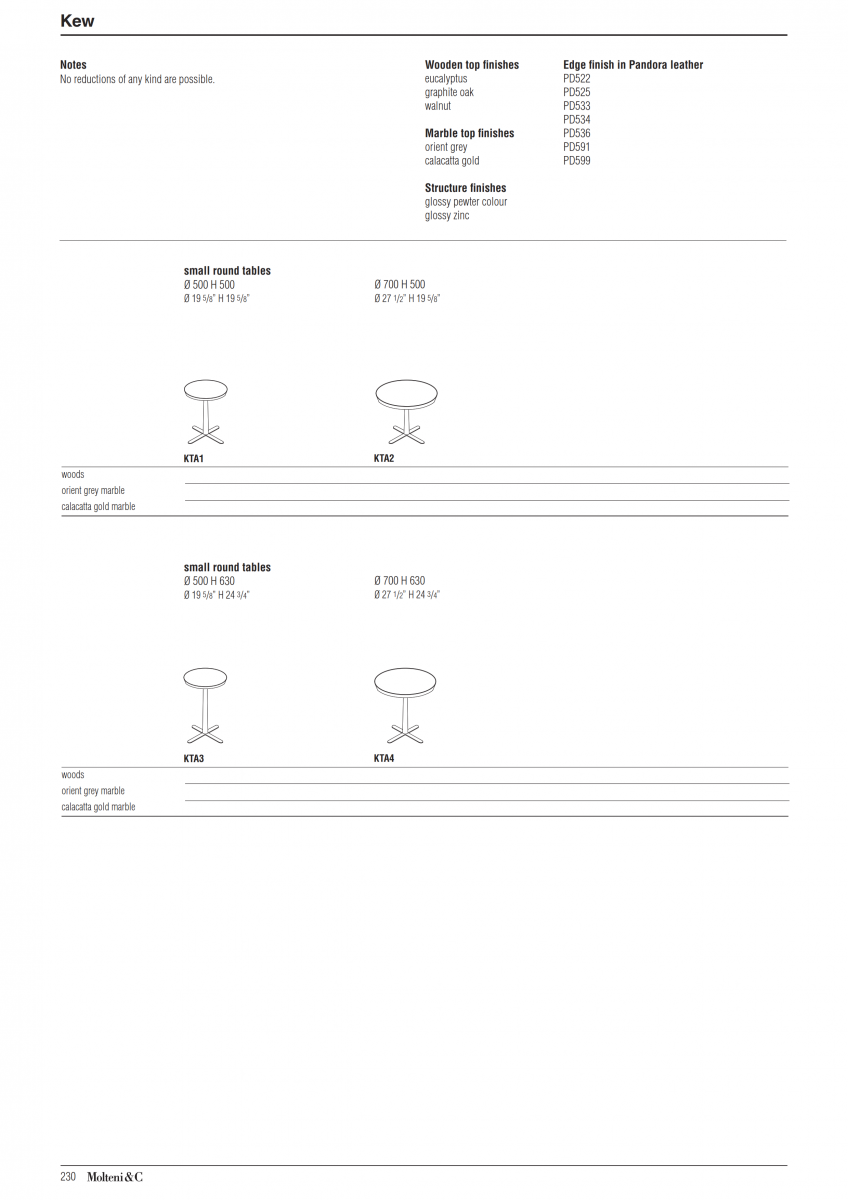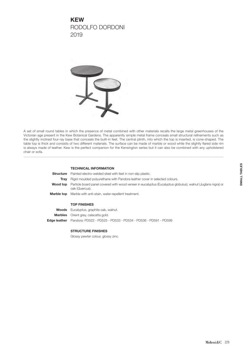 A set of small round tables in which the presence of metal combined with other materials recalls the large metal greenhouses of the Victorian age present in the Kew Botanical Gardens. The apparently simple metal frame conceals small structural refinements such as the slightly inclined four-ray base that conceals the built-in feet.