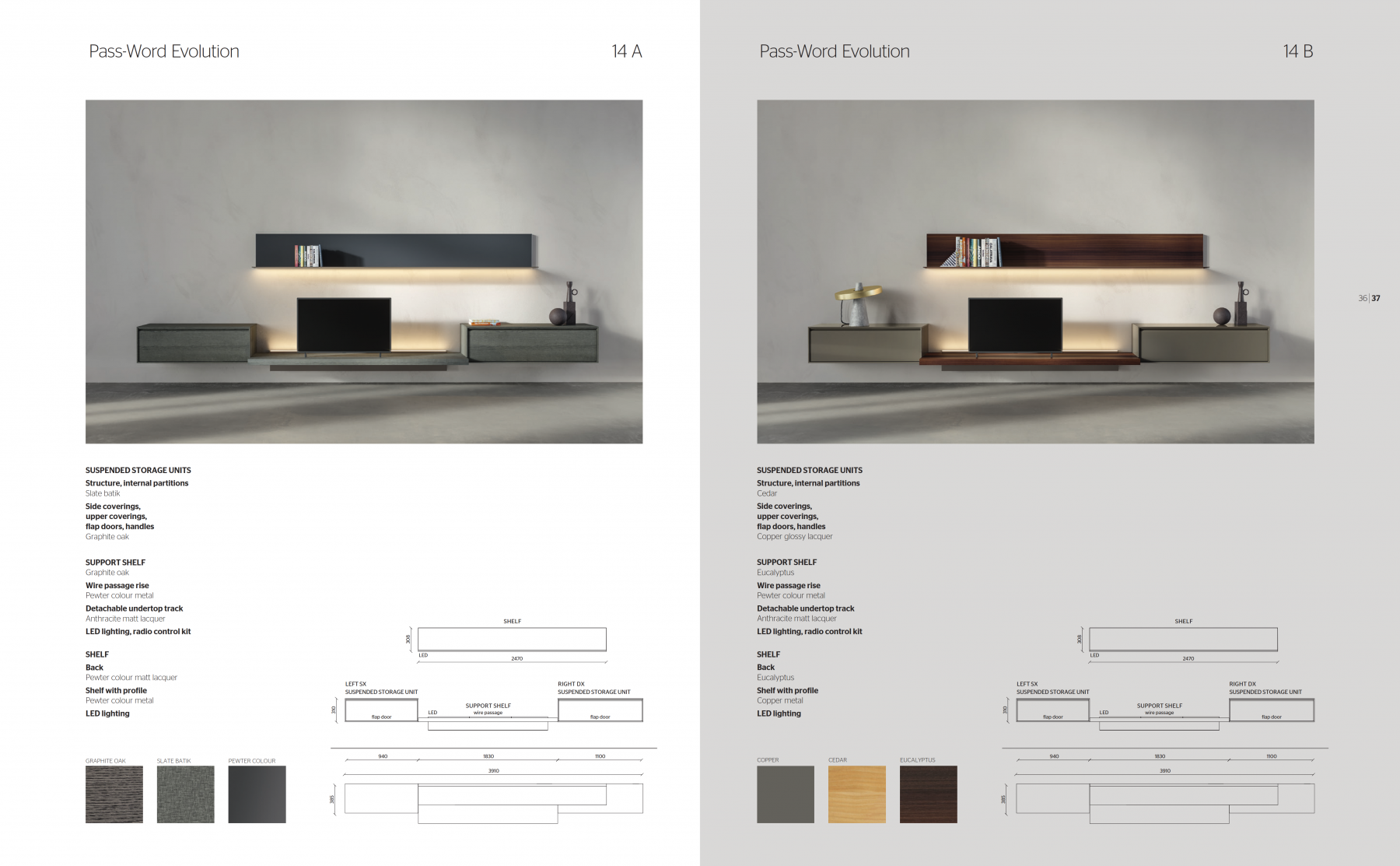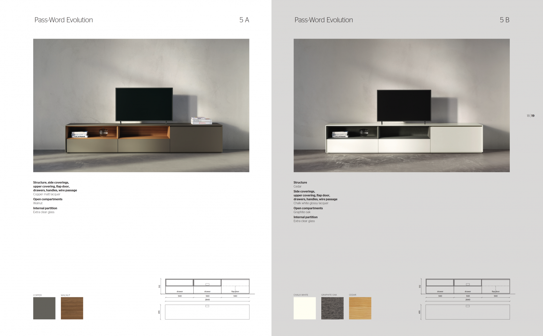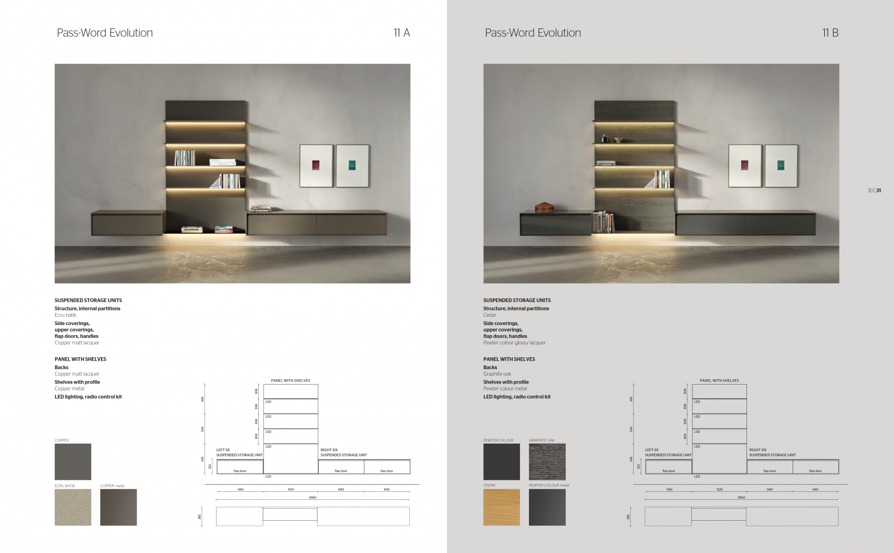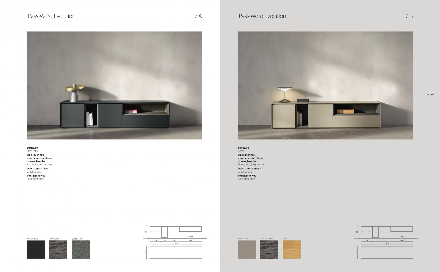 Pass-Word, design Dante Bonuccelli, the living-room system designed for contemporary homes, is evolving radically to meet new ways of using domestic spaces, marked by the growing presence of multimedia entertainment systems and/or Home Working, alongside the more traditional objects such as books and ornaments.