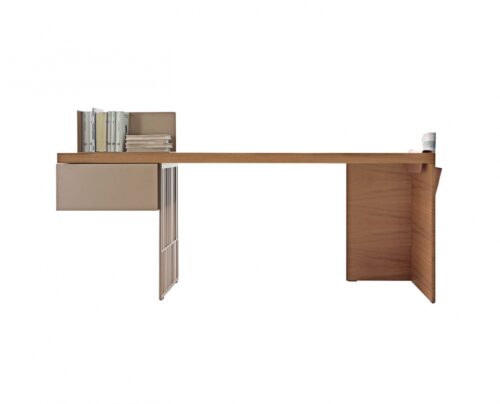 A desk with very clean lines and a decoratively perforated top support element that conveys a sense of lightness. Wood surfaces, a practical lateral drawer, a clever book support element in painted sheet metal and a side pocket in hide leather complete the desk. The bookend support leans on the top and it can be positioned in the desired direction.