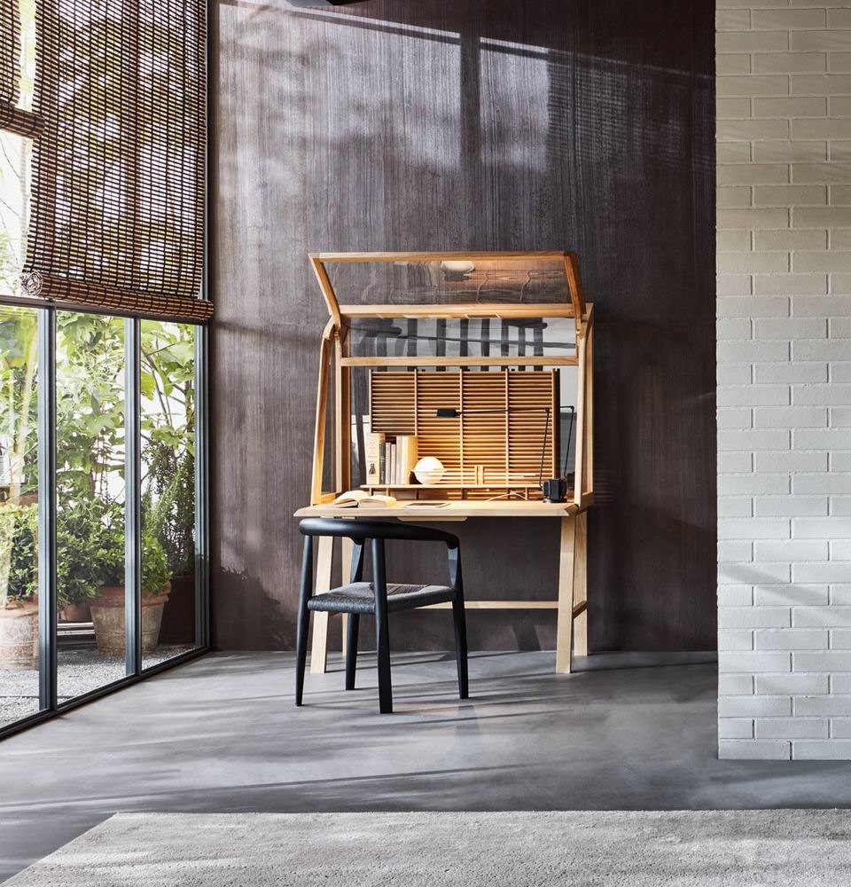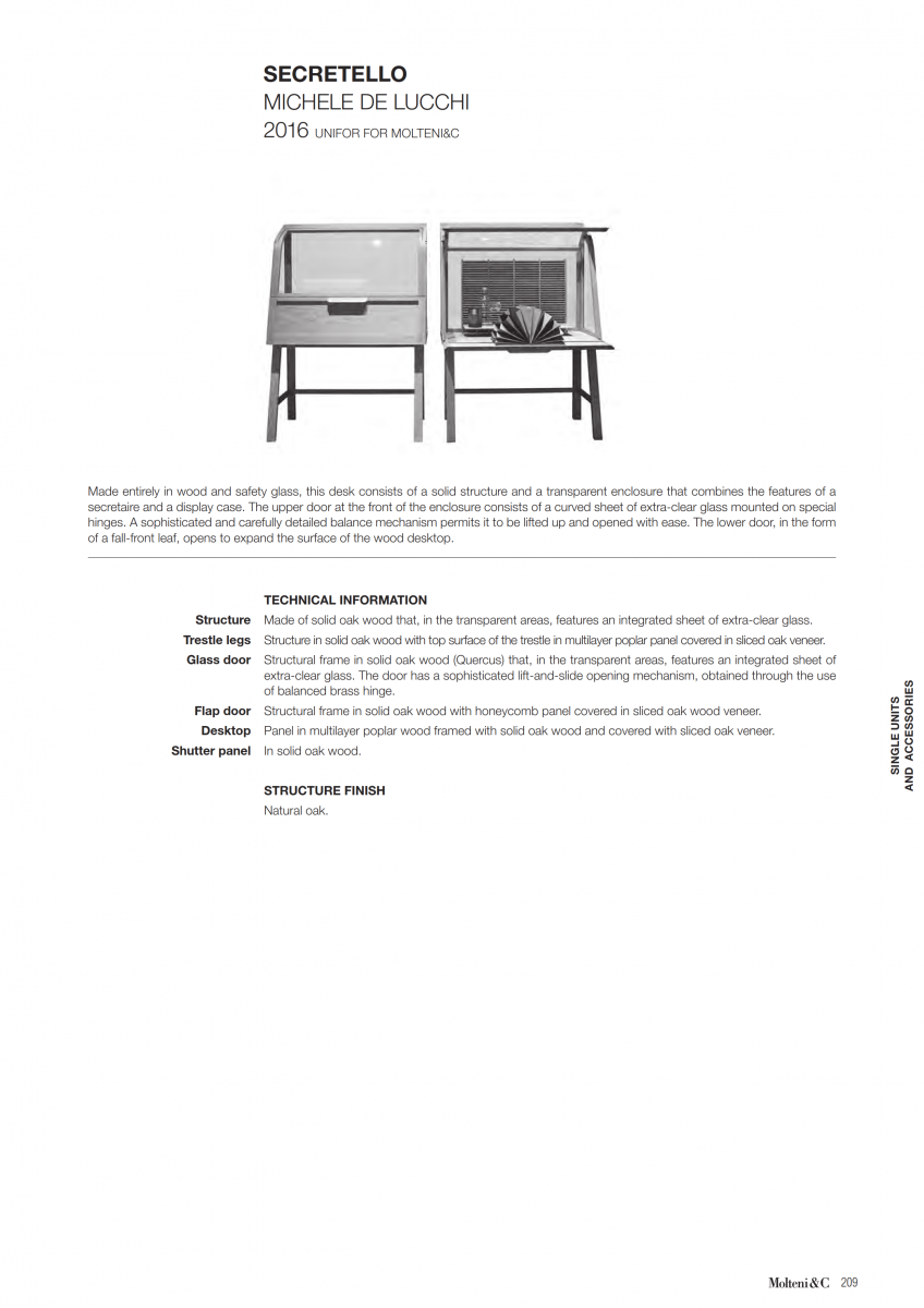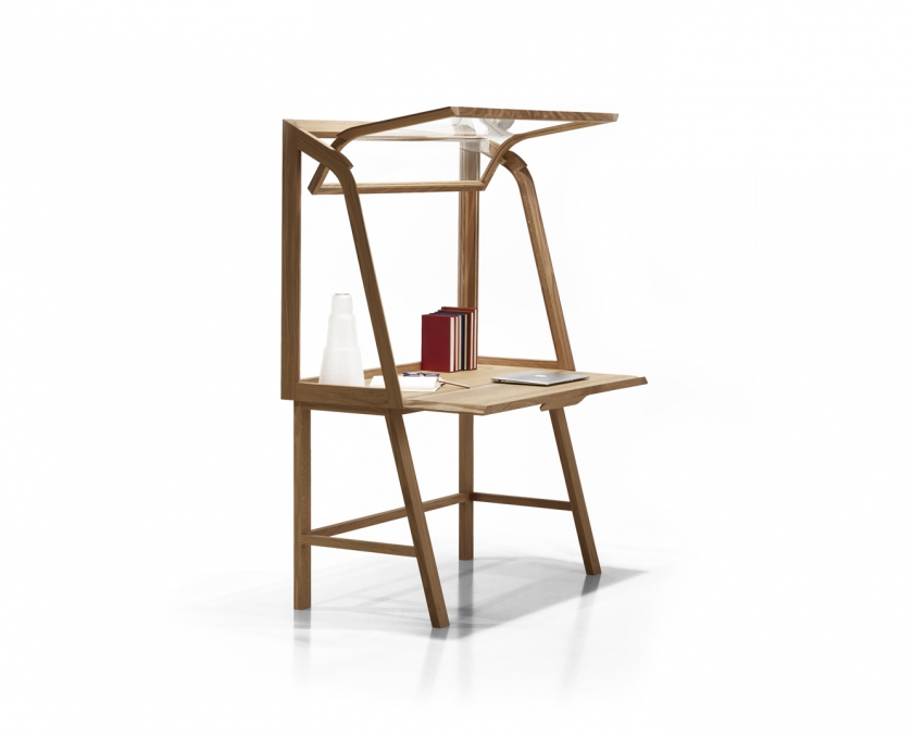 Secretello is a desk designed like a modern workstation, functional and self-sufficient. It reinterprets the theme of the secrétaire associated with that of a glass display cabinet in a contemporary key.