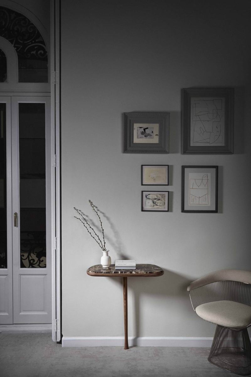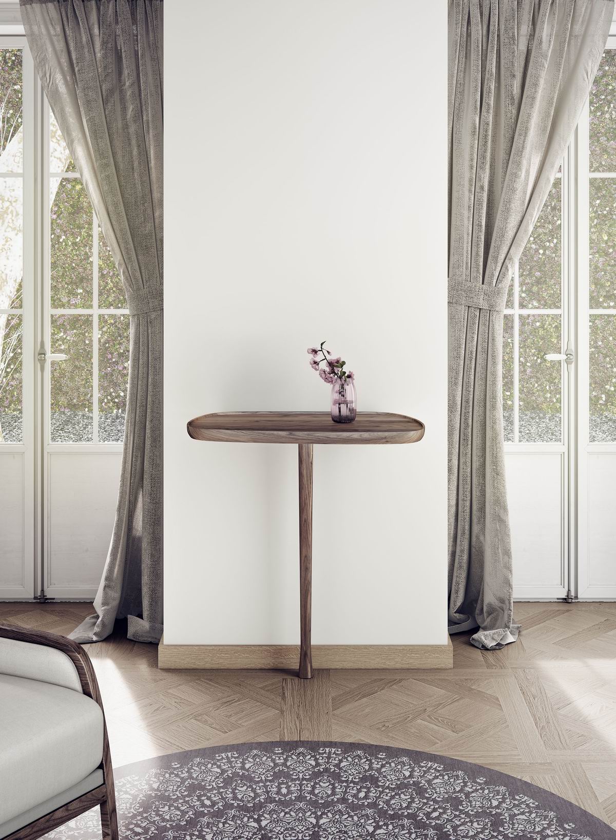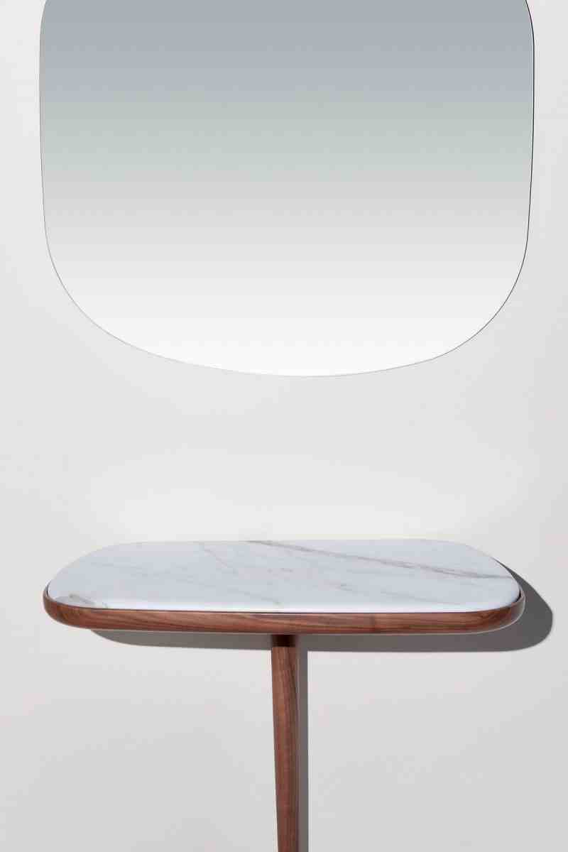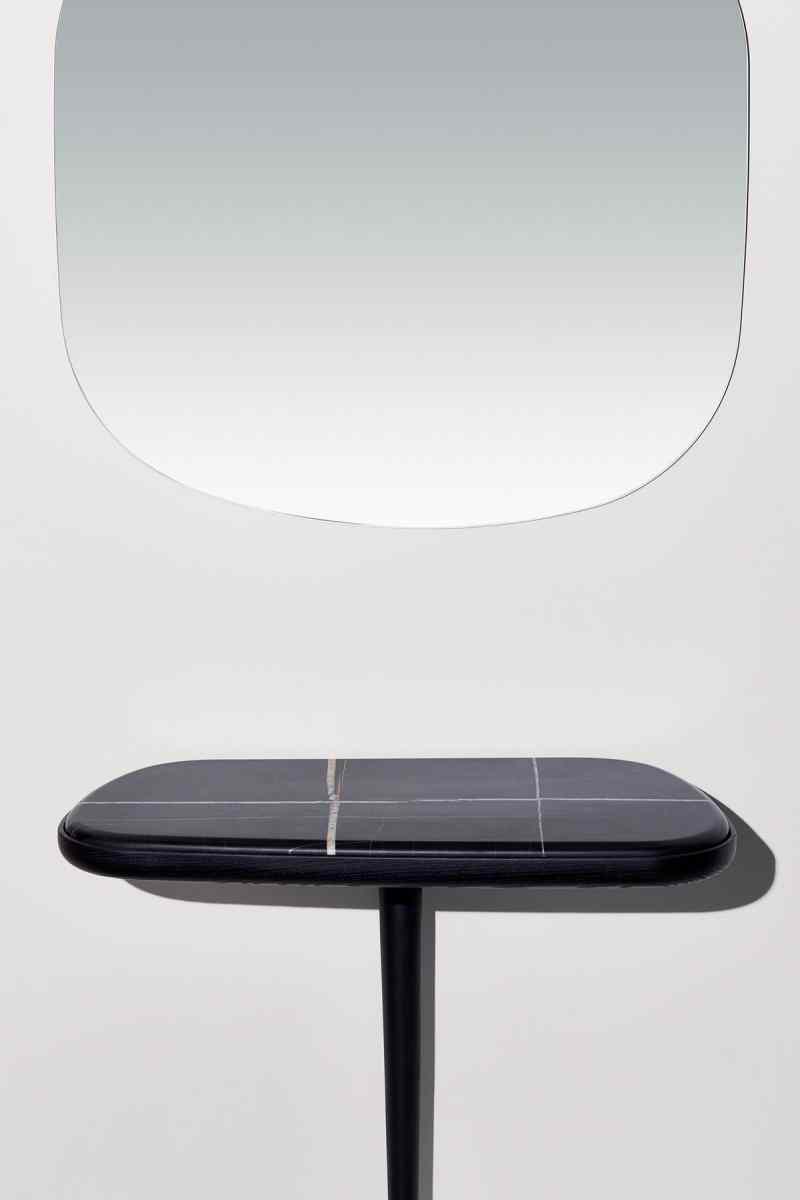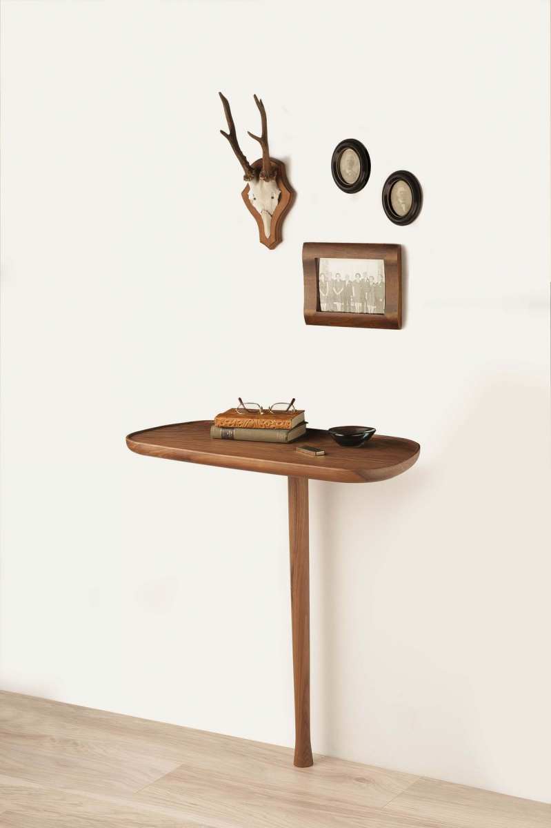 Its bold design is characterized by standing on just one leg. The piece hides an invisible wall-fixing, an amusing visual game that seems to challenge physics.