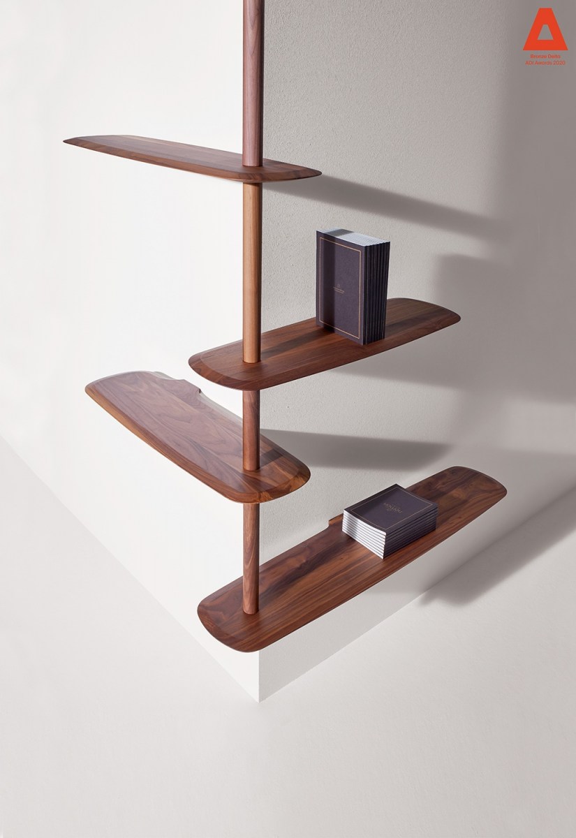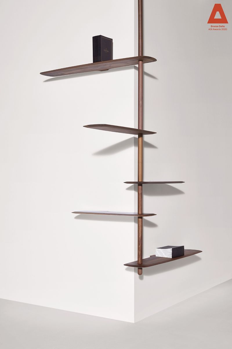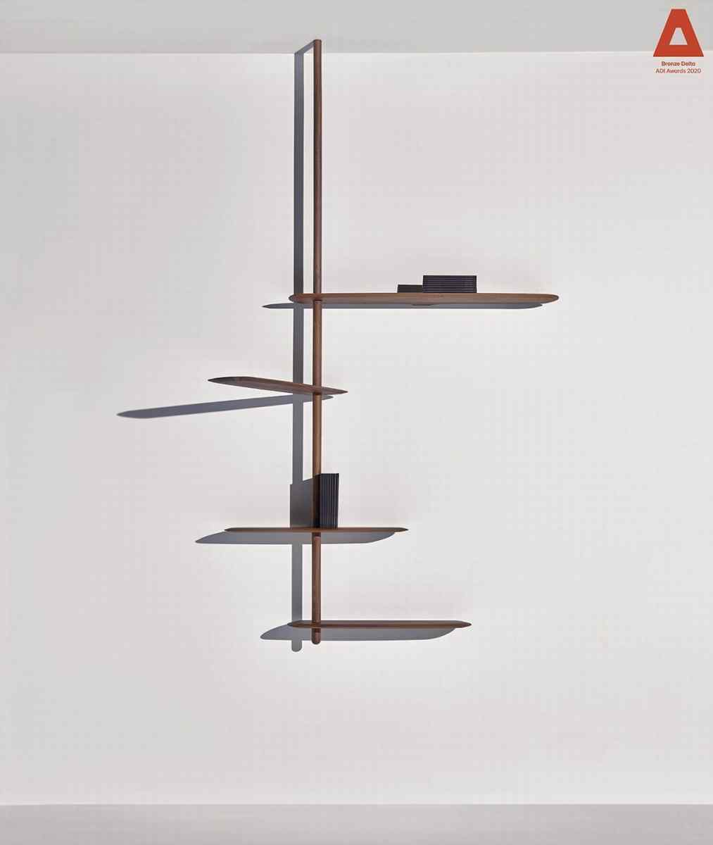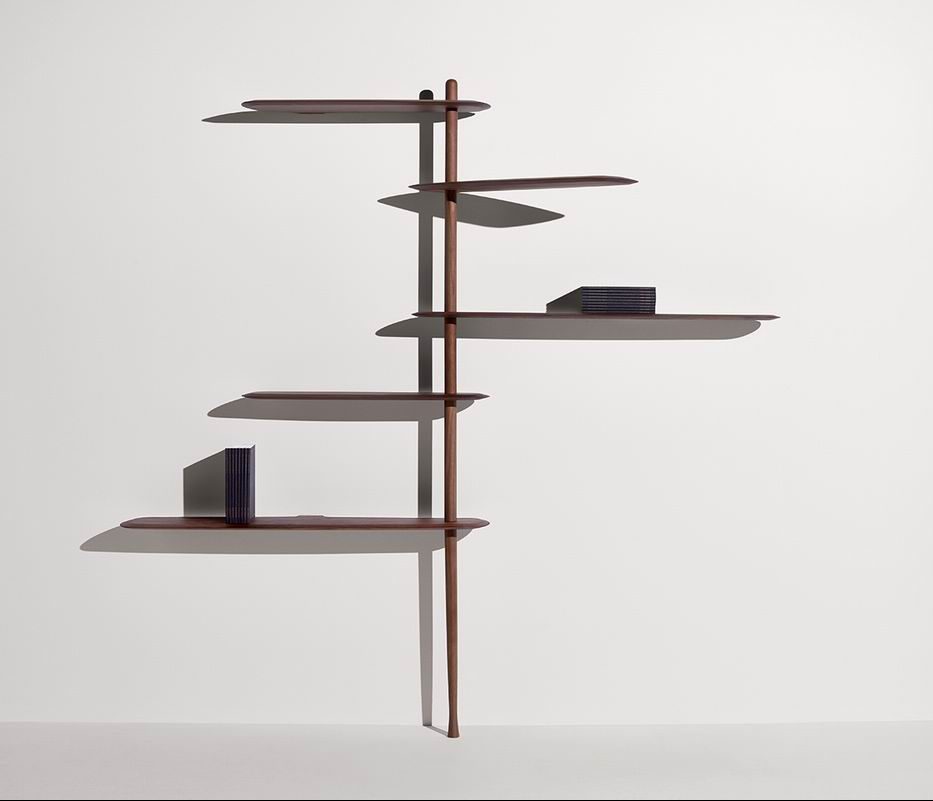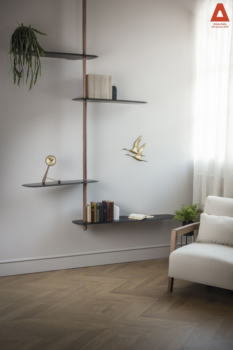 Modular system consisting of shelves and rods with different sizes. The system stands due to a central base in which you can alternate fixed shelves to the wall with floating shelves, providing strength and flexibility to the structure at the same time.