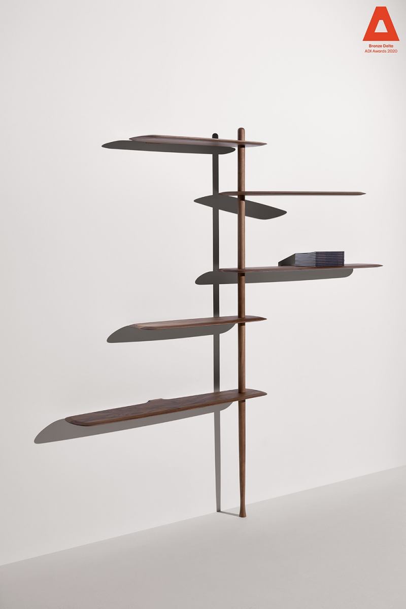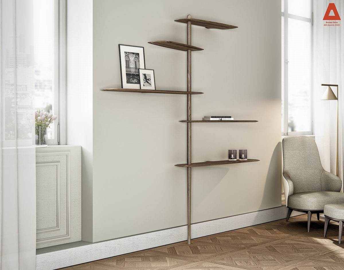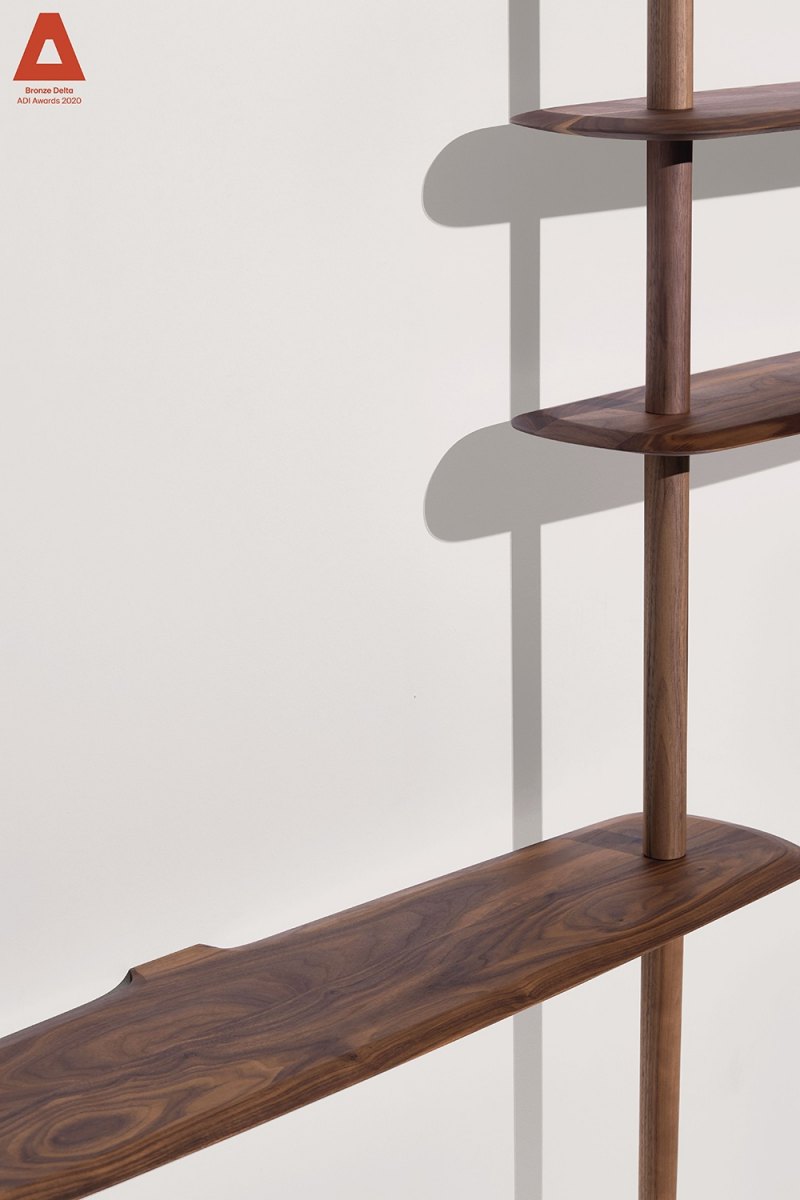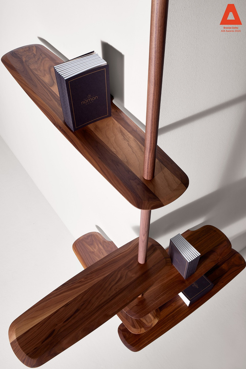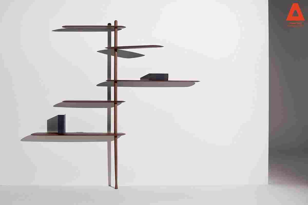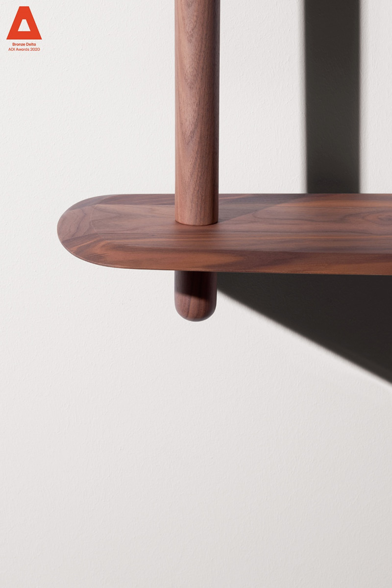 Modular system consisting of shelves and rods with different sizes. The system stands due to a central base in which you can alternate fixed shelves to the wall with floating shelves, providing strength and flexibility to the structure at the same time.
