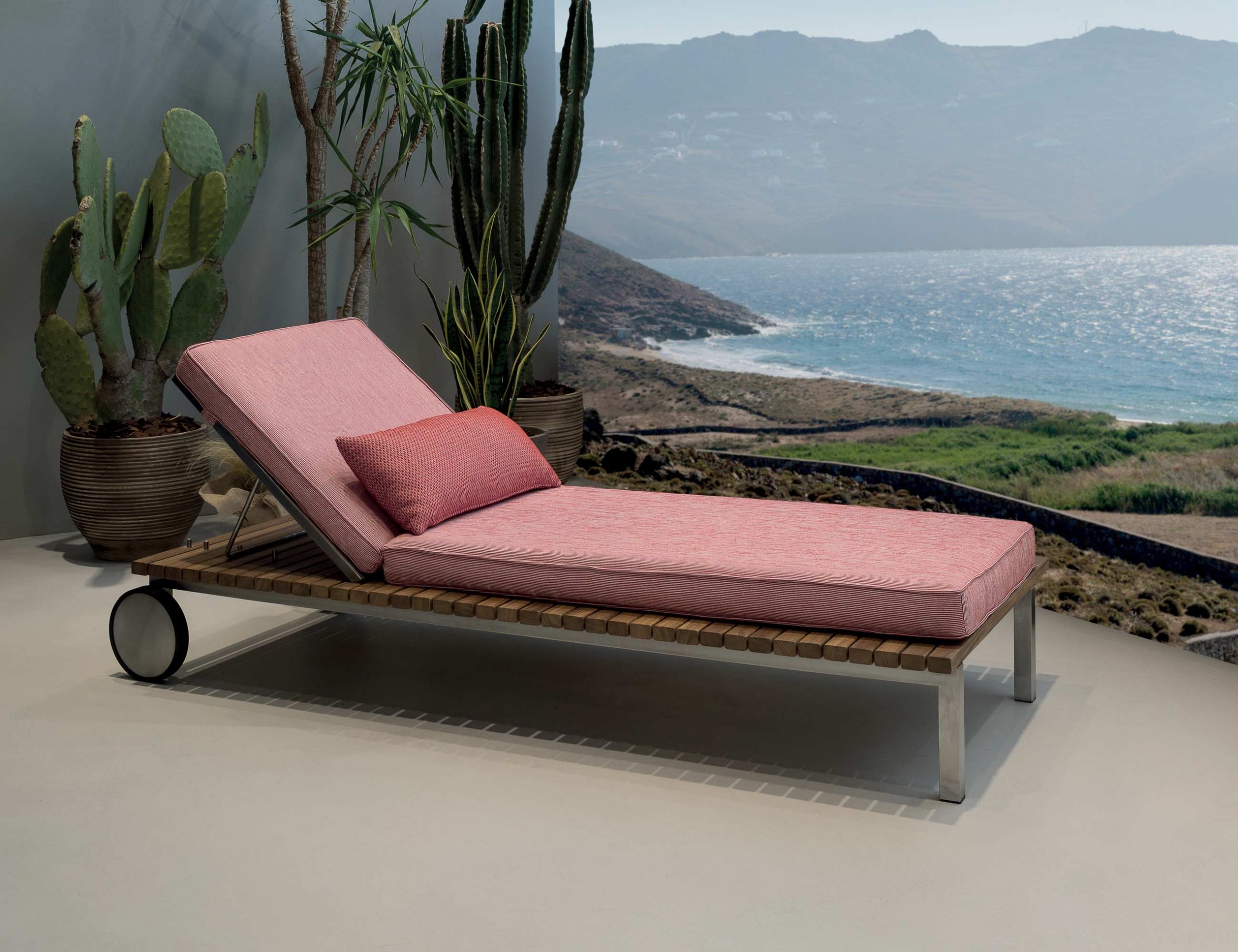 Η συλλογή Aria παράγεται από ξύλο Teak και ανοξείδωτα εξαρτήματα, έναν συνδυασμό που δημιουργεί μια ισορροπημένη εναλλαγή γραμμών και υλικών.