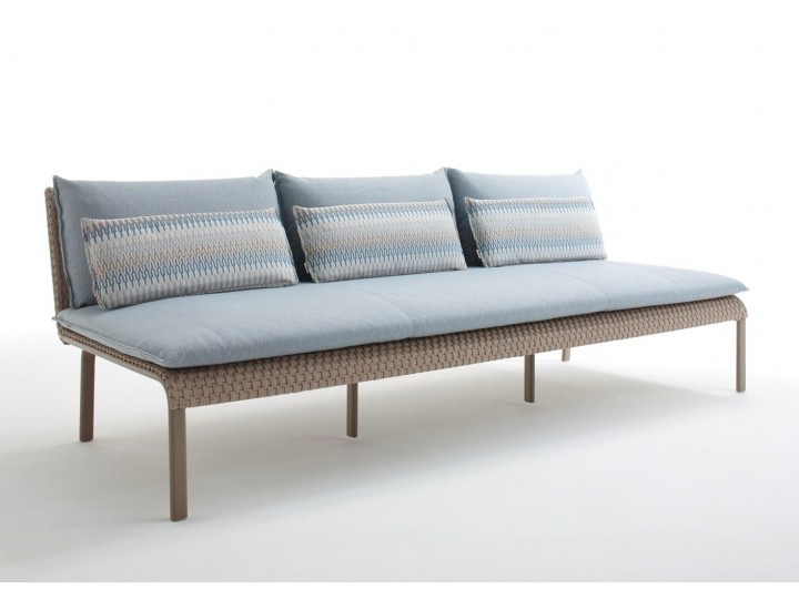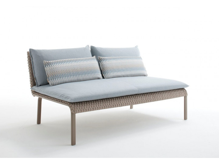 Διθέσιος καναπές εξωτερικού χώρου, από σκελετό αλουμινίου με επίστρωση πούδρας, και πλέξη Sunrope. Ολόκληρη η σειρά είναι αρθρωτή και, χάρη στην κομψότητα και τη δυναμικότητα των σχημάτων της, ενσωματώνεται αρμονικά σε εσωτερικούς και σε εξωτερικούς χώρους. Το φιλόξενο κάθισμα και η εργονομική πλάτη χαρίζουν απόλυτη χαλάρωση. Ολόκληρη η συλλογή Key West είναι κατάλληλη τόσο για το σπίτι όσο και για μονάδες.